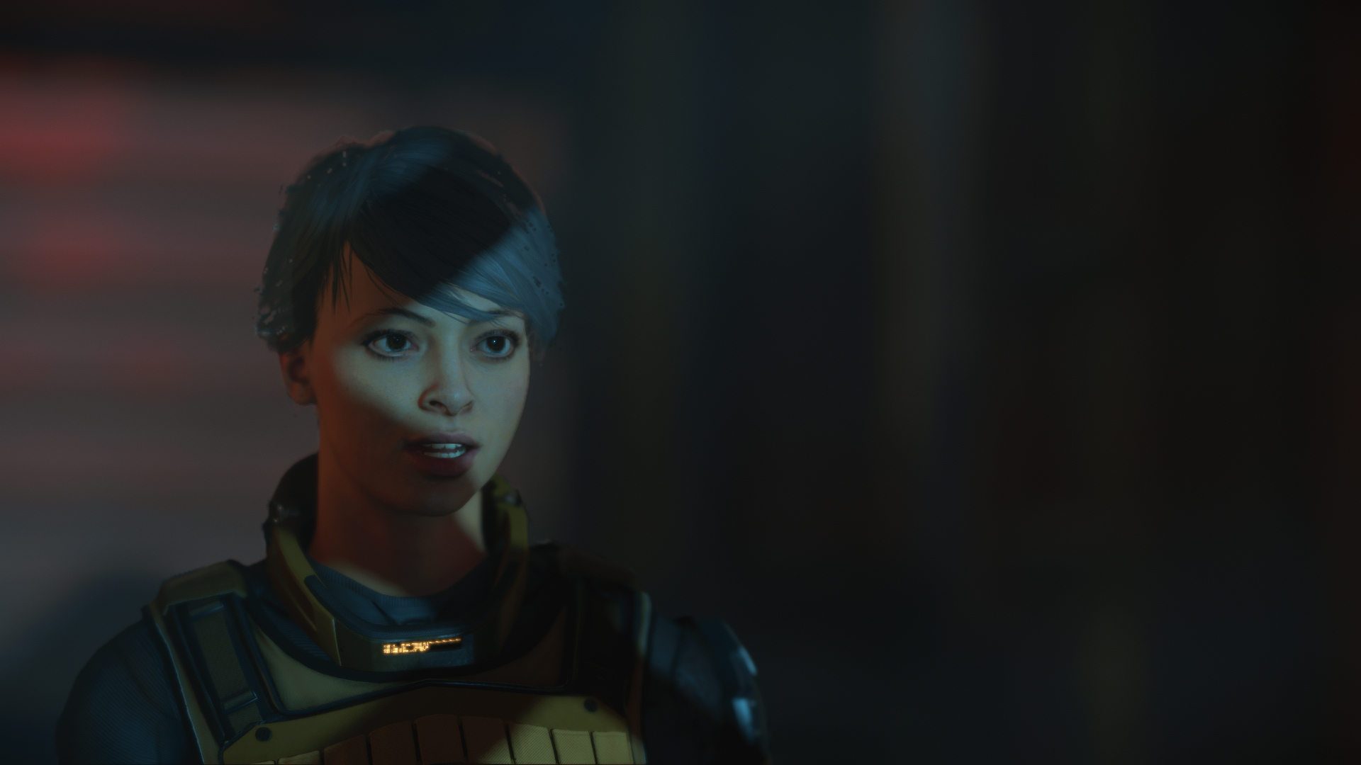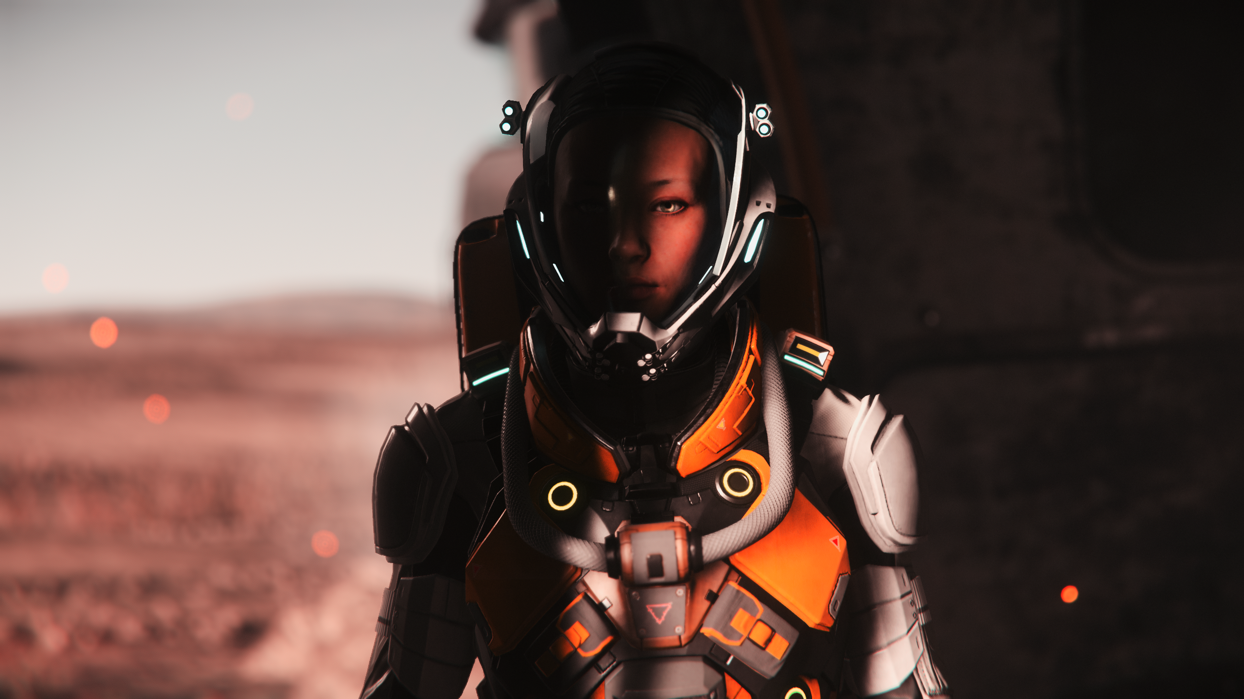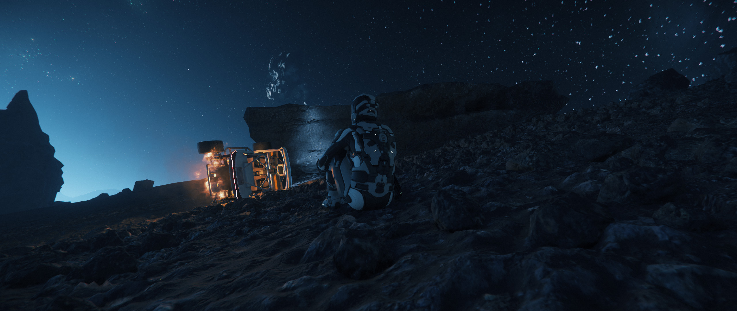 This was my favorite shot from the get go. The framing both with the shot and in the shot, through the use of debris is phenomenal. The character’s pose tells a story of unexpected disaster, and the beautiful colored moon in the distance provides a sense of scale and weight. This looks like a scene from The Expanse.SpaceTomato