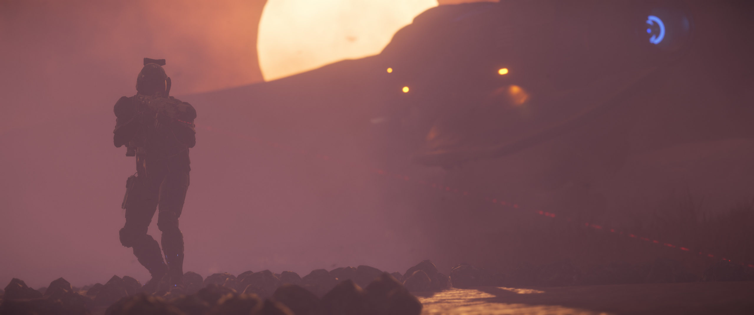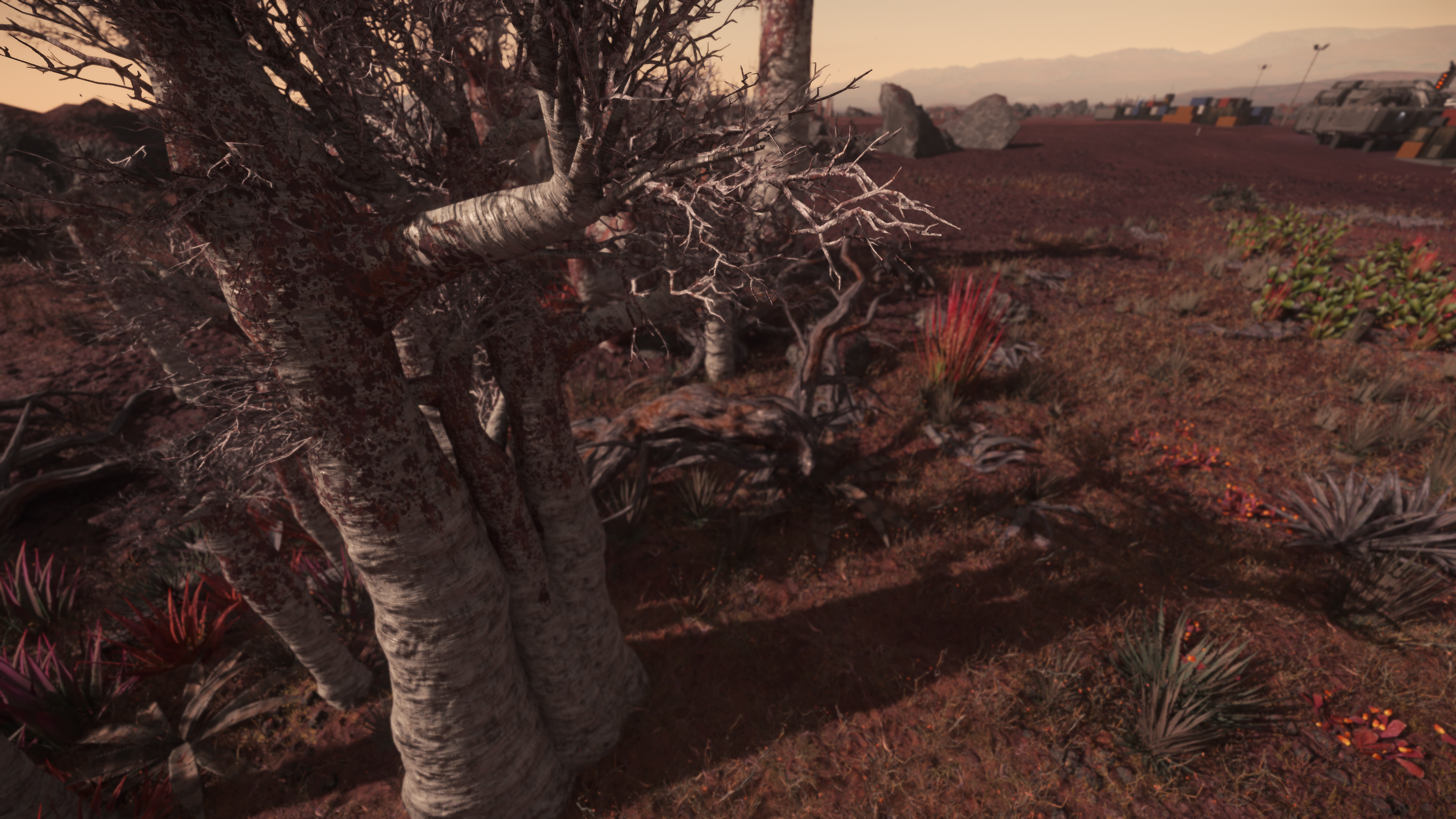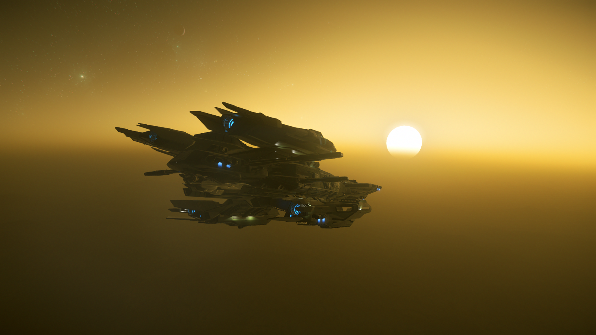 Immediately, the detail in the Gladius jumps out at me here. While sunset screenshots are about as common as 30ks, the detail in this shot works great with the gradient of colors and wispy clouds. Though I would opt for no dirt in the air, a product of the location, and I would also want to see the ground to provide more sense of scale with the trees.SpaceTomato