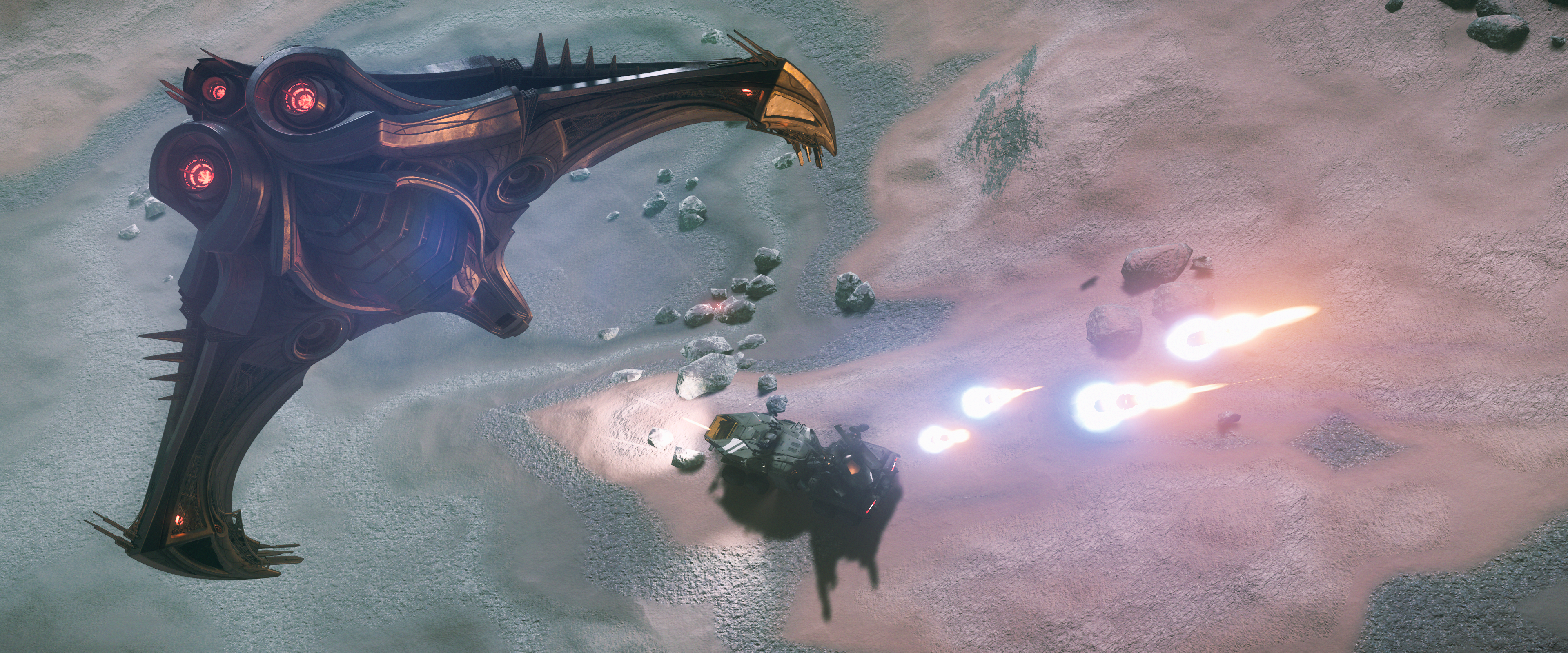 This shot brings out the poetic effect of Silver surpassing Gold per se. The contrast of colors makes the shot dynamic even in its stillness. The subtle defocus, and the framing of the Ares foreshadows the very essence of the ship and why it is THE God of War. This is a shot of many layers and depth to it, a story in itself. A true Caliber shot if I may add!RedSolstice