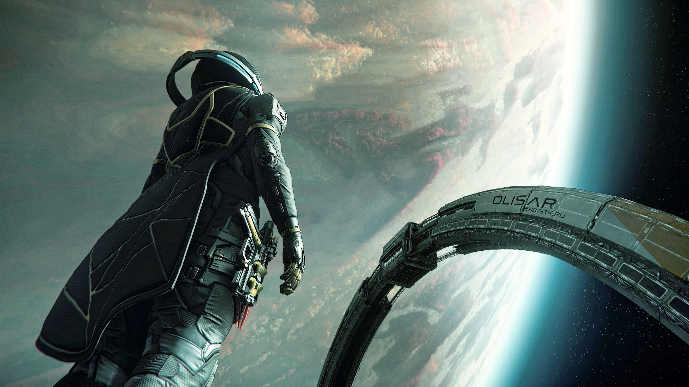 A very cleverly captured shot that challenges our perspective of what’s above and what’s below. We see the clouds of Crusader that seem to provide a primary reference, and then the Character and the rings of Olisar take it away all over, creating an arid suspense within the composition. The choice of the Artimex armor and the Yubarev pistol, more specifically their gold accents provide the much necessary contrast to the blandness of the gas giant.RedSolstice