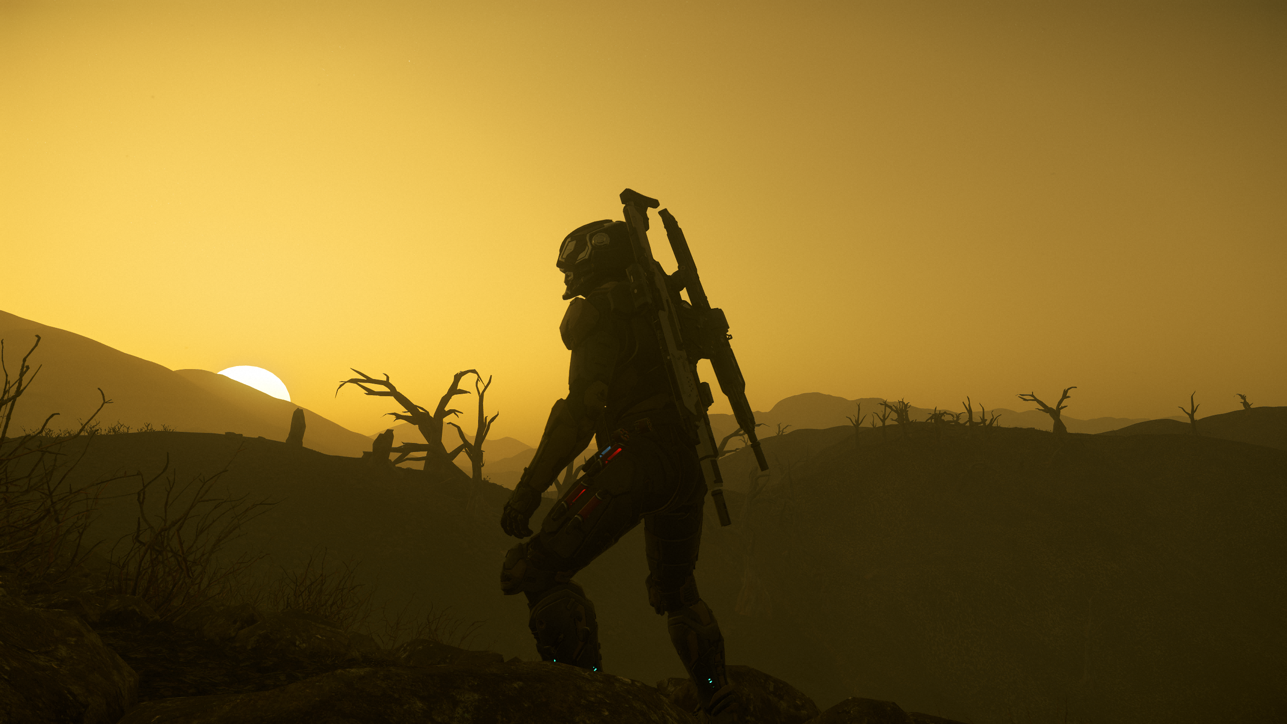 A very cleverly captured shot that challenges our perspective of what’s above and what’s below. We see the clouds of Crusader that seem to provide a primary reference, and then the Character and the rings of Olisar take it away all over, creating an arid suspense within the composition. The choice of the Artimex armor and the Yubarev pistol, more specifically their gold accents provide the much necessary contrast to the blandness of the gas giant.RedSolstice