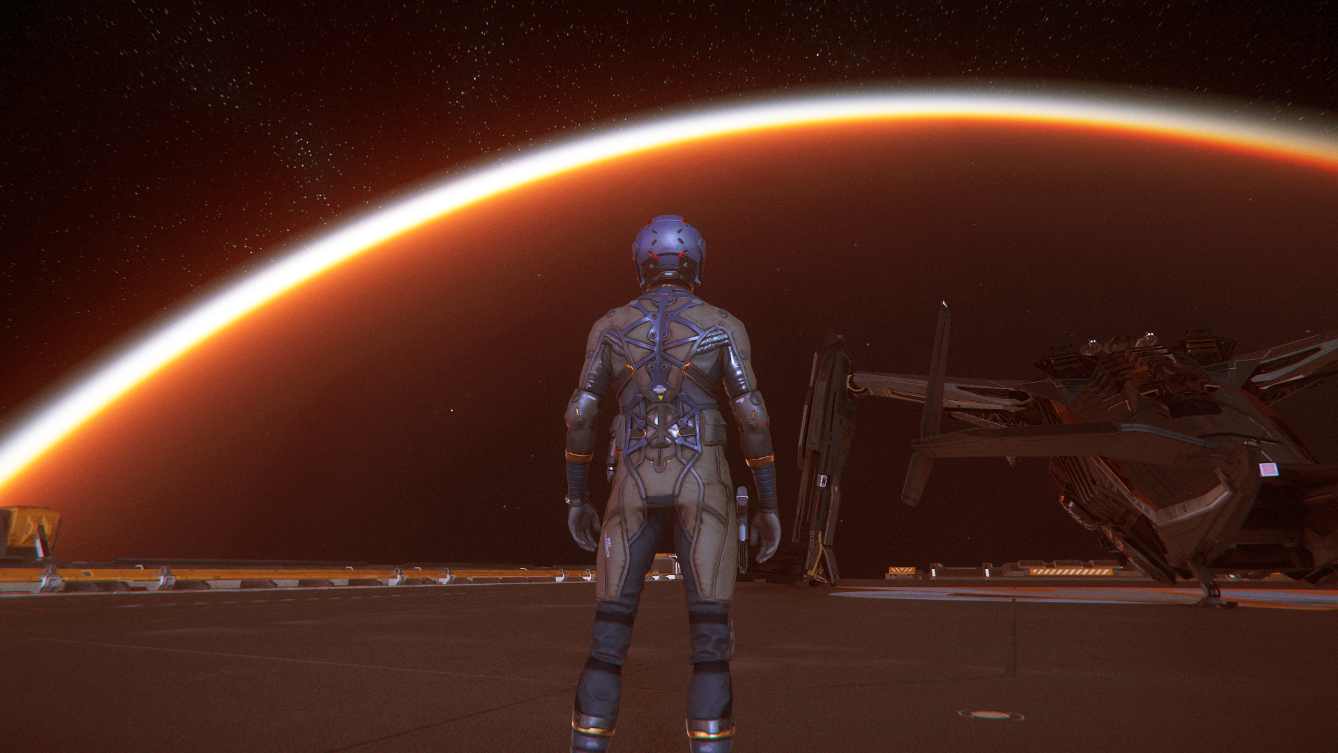 Another not-so-unique image within Star Citizen, but again, one executed brilliantly. For me, the lighting and framing is perfect and makes this a joy to look at. A mostly silhouetted figure with only minimal highlights set against an offset microTech. Well done.Hasgaha