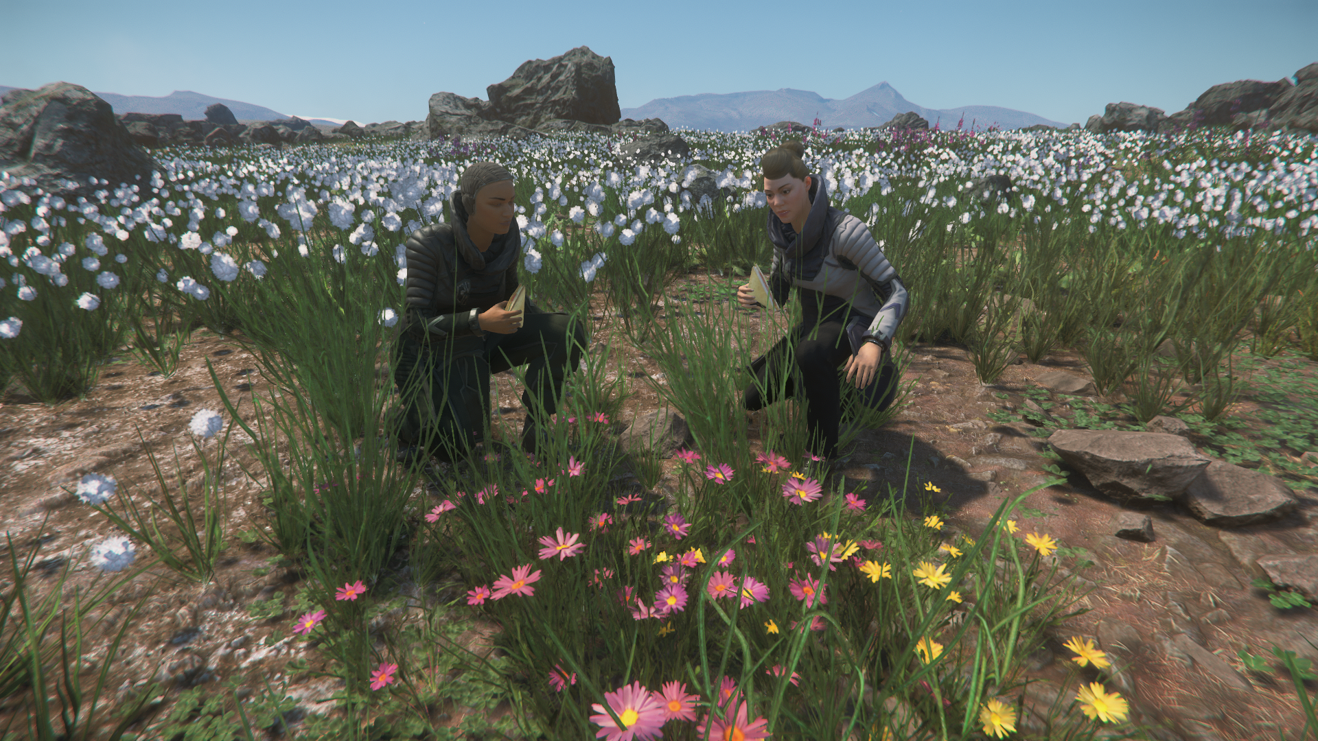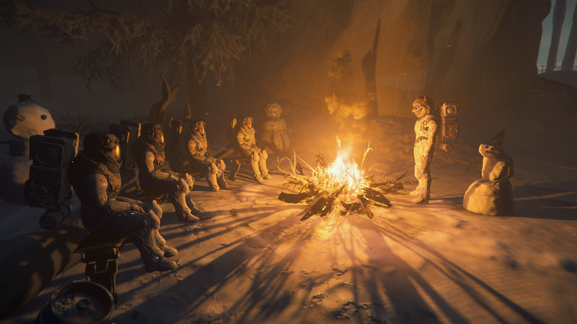 I have my usual complaints about the game graphics in this shot (the branches in the foreground, the weird jagged ground, and the streaks of dust). But all that aside (which is out of the player’s control), this is a great shot. It’s peaceful and makes me want to know what this group is about to do together.Hasgaha